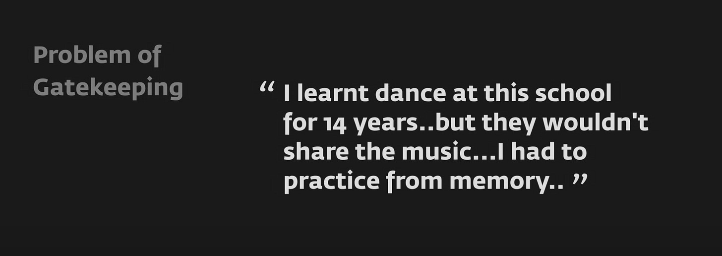 While researching online, I came across a powerful quote from a research participant in Yukti Arora’s Master’s dissertation presentation on Democratizing Bharatanatyam that perfectly encapsulated the issue.